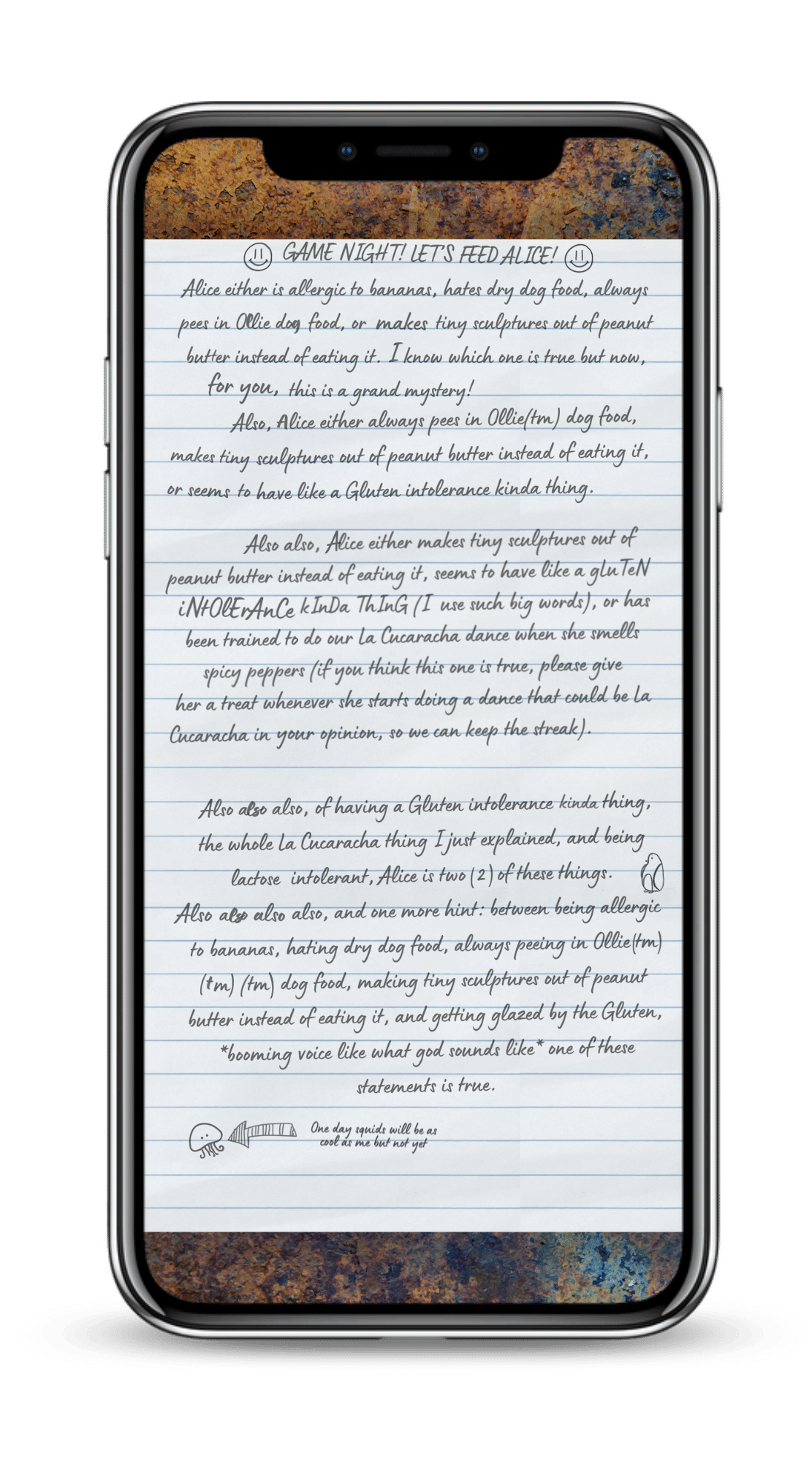 We can trust Boo. Based on his hints, put together a message about what Alice can and can't eat.